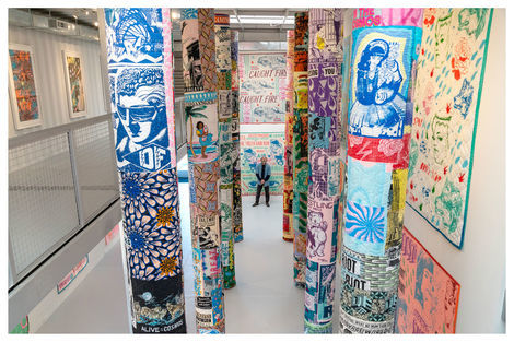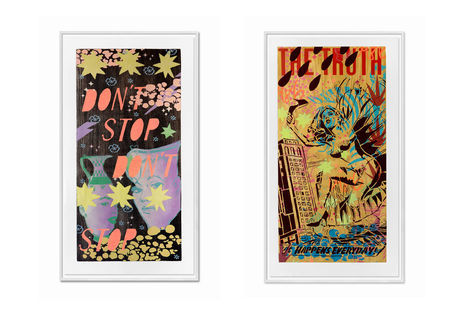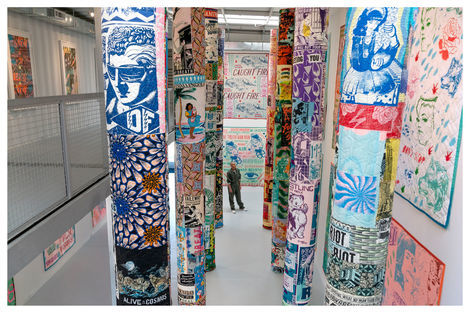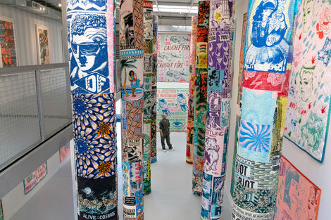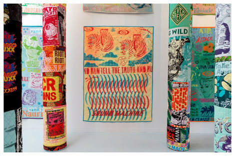 Since 2008, a significant part of their work has been inspired by traditional craft movements, particularly quilt making and woodwork. FAILE found quilt making closely aligned with their collage process—taking disparate elements of type and imagery, each with its own history, and weaving them together to create new narratives and icons. Much like historic quilts that repurposed discarded fabrics into something functional and beautiful, FAILE transforms cultural scraps of time into cohesive works of art.